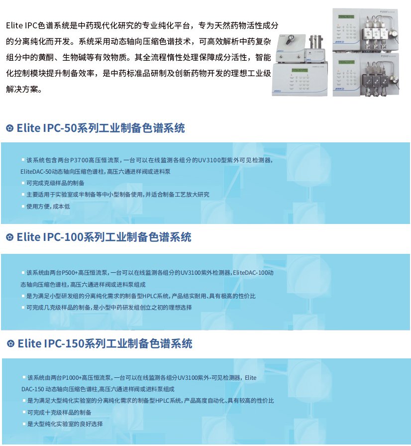 依利特科技高壓半制備液相色譜系統(tǒng)EClassical3500/3700,將分析和半制備一體化,為您提供完整的分析和制備化合物的自動(dòng)HPLC應(yīng)用方案。該系統(tǒng)可以方便實(shí)現(xiàn)分析與半制備系統(tǒng)之間的切換,還可完成樣品進(jìn)樣、餾分收集等功能。依利特工業(yè)制備Elite IPC色譜系統(tǒng),完成從幾克級(jí)至十克級(jí)樣品的制備,是小型中藥研發(fā)和大型純化實(shí)驗(yàn)室的良好選擇。