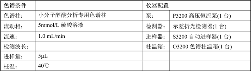 使用依利特新的EClassical 3200高效液相色譜儀,搭配小分子醇酸分析專用色譜柱,能很好的將目標(biāo)物分離,且峰形良好,滿足定性定量分析的要求。