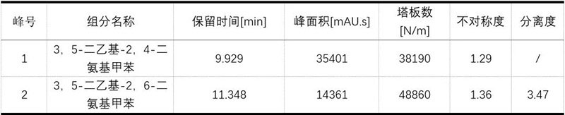 依利特新款的EClassical3200液相色譜儀搭配經(jīng)典的SinoPak C18色譜柱,對二乙基甲苯二胺同分異構(gòu)體進(jìn)行分析,分離度非常好,柱效也很高,滿足定性定量分析的需求。