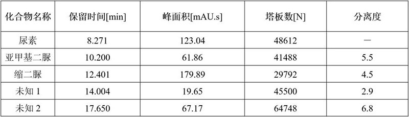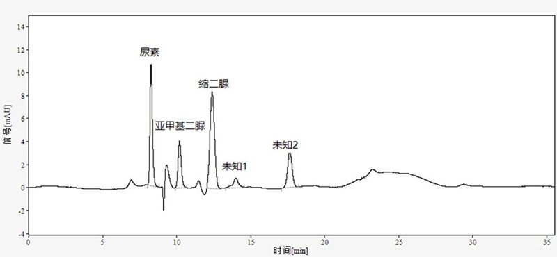 使用EClassical 3200液相色譜儀匹配SinoChrom ODS-BP色譜柱,對樣品進行分析,尿素、亞甲基二脲、縮二脲等組分,其分離度均大于1.5,實現(xiàn)完全分離。
