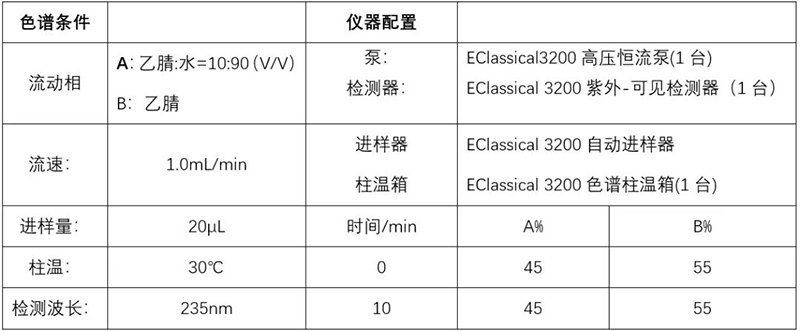 使用依利特EClassical 3200液相色譜儀匹配Supersil ODS2 色譜柱分析飼料中的肉桂醛,目標(biāo)物峰形良好,可以與旁邊的相關(guān)物質(zhì)能達(dá)到良好的分離,滿足定量分析的需求。