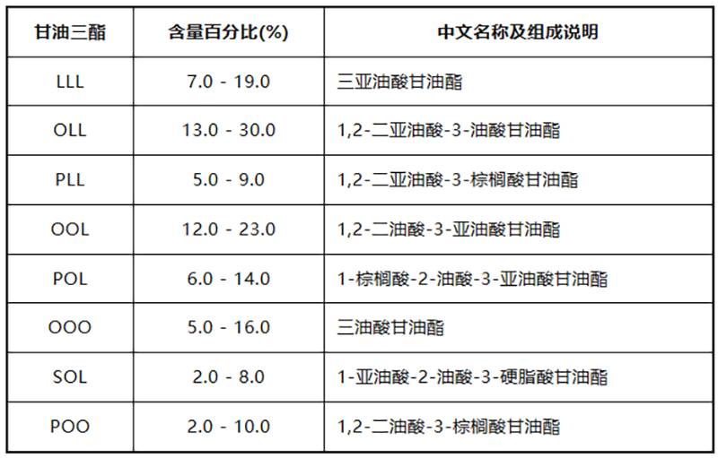 注:L - 亞油酸,O - 油酸,P - 棕櫚酸,S - 硬脂酸