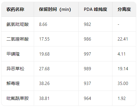 6 種農(nóng)藥實(shí)現(xiàn)基線分離,分離度均>1.5,峰純度優(yōu)異,關(guān)鍵參數(shù)如下:
