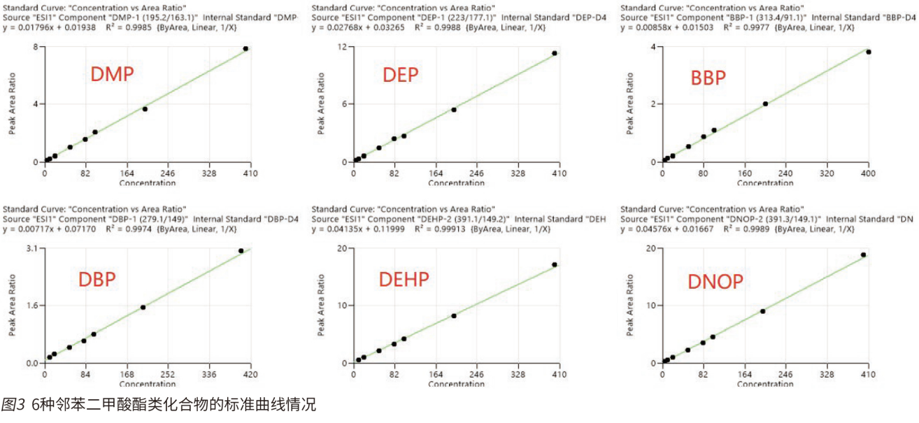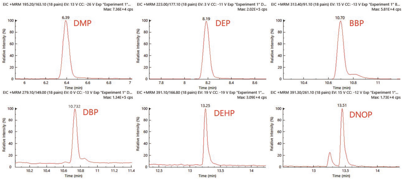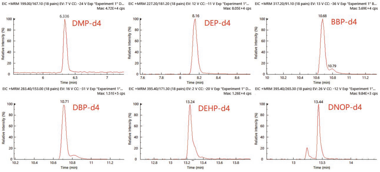 (圖 2 6 種鄰苯二甲酸酯類化合物及其內(nèi)標(biāo)的提取離子色譜圖(濃度為 100μg/L):包含 DMP、DEP、BBP、DBP、DEHP、DNOP 及其對(duì)應(yīng)內(nèi)標(biāo) DMP-d4、DEP-d4、BBP-d4、DBP-d4、DEHP-d4、DNOP-d4 的色譜圖,橫坐標(biāo)為時(shí)間(min),縱坐標(biāo)為響應(yīng)值相關(guān)參數(shù),圖中標(biāo)注了各化合物及內(nèi)標(biāo)的出峰時(shí)間,如 DMP 約 6.39min、DEP 約 8.19min、BBP 約 10.70min、DBP 約 10.732min、DEHP 約 13.25min、DNOP 約 13.51min 等,內(nèi)標(biāo)出峰時(shí)間與對(duì)應(yīng)化合物相近)