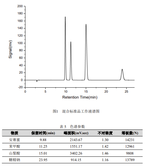 該解決方案在滿足 GB5009.28-2016《食品中苯甲酸、山梨酸和糖精鈉的測(cè)定》要求的前提下,不僅可以同時(shí)檢測(cè)四種食品添加劑,還解決了使用普通 C18 色譜柱壽命短的問題,僅供大家參考使用!