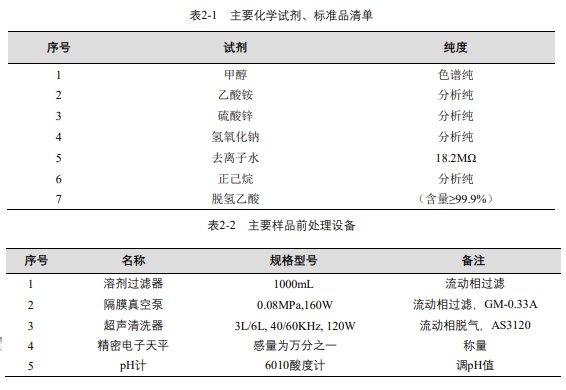 實驗過程中其它玻璃器皿還包括容量瓶 (100mL、50mL、25mL、10mL)、移液槍 (0~1000μL,0~5000μL)、移液槍槍頭 (1mL,5mL)、一次性 PVC 手套、一次性口罩、進樣針、濾膜等若干。