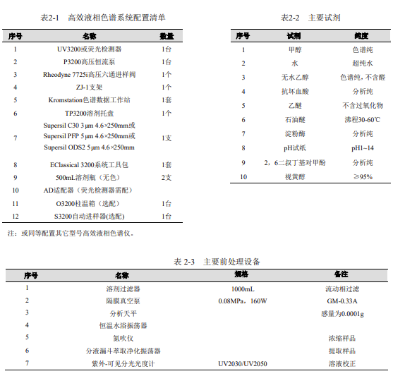 附錄文件:GB 5009 系列、GB 14750 等標準原文節(jié)選、維生素標準溶液校正詳細步驟、耗材訂貨清單(色譜柱、試劑、濾膜型號編碼)。