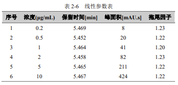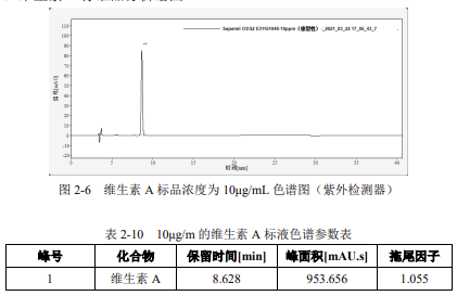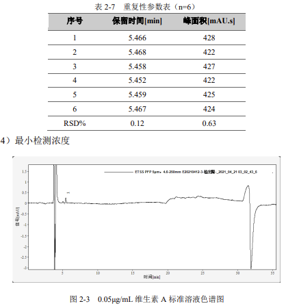 重復性:用濃度為 10μg/mL 維生素 A 標準溶液,連續(xù)進樣 6 針,峰面積和保留時間 RSD 結(jié)果如下: