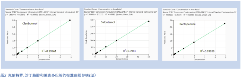 十三種 β- 受體激動劑在 0.05μg/L-5μg/L 濃度范圍內(nèi)均呈現(xiàn)良好的線性關(guān)系,相關(guān)系數(shù)≥0.995,典型代表化合物克倫特羅、沙丁胺醇和萊克多巴胺的標準曲線(內(nèi)標法)見圖 2。