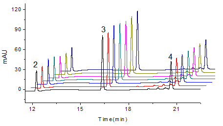 (484nm,n=7,以2號峰為例,峰面積RSD=0.81%,保留時間RSD=0.11%)