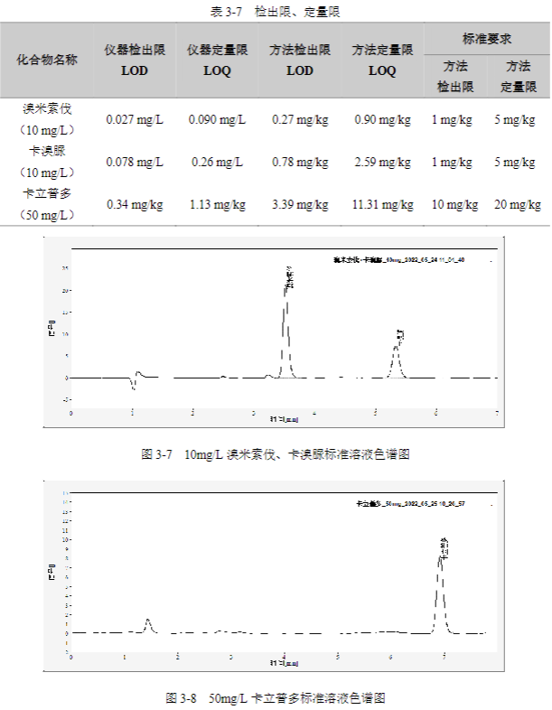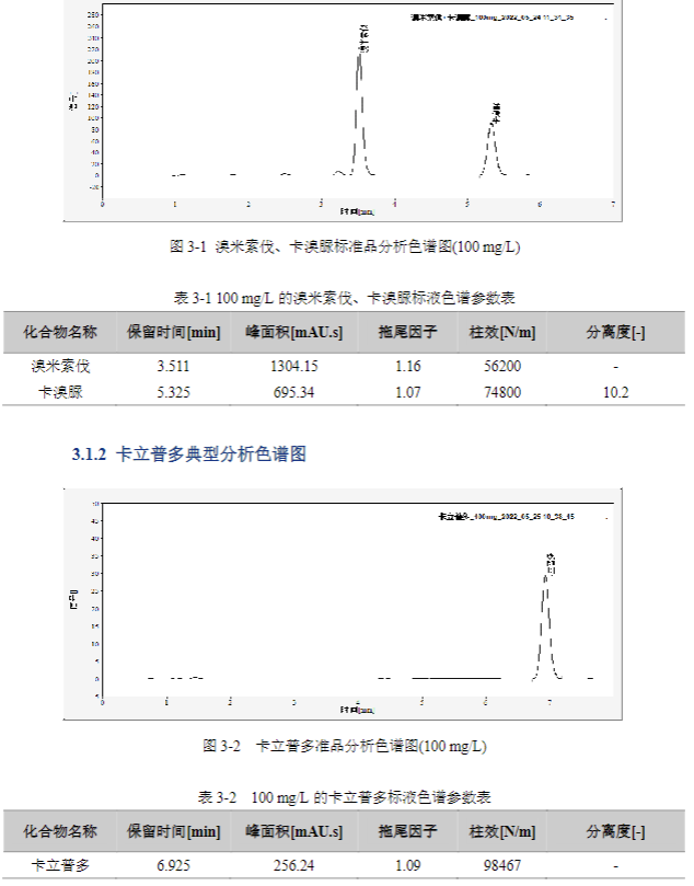 在溴米索伐、卡溴脲檢測的色譜條件下,儀器的基線噪音為 0.0193 mAU(S/N=3),10 mg/L 溴米索伐、卡溴脲標(biāo)準(zhǔn)品溶液峰高為 21.356 mAU、7.456 mAU(圖 3-7);在卡立普多檢測的色譜條件下,儀器的基線噪音為 0.0185 mAU(S/N=3),50 mg/L 卡立普多標(biāo)準(zhǔn)品溶液峰高為 8.181 mAU(圖 3-8);