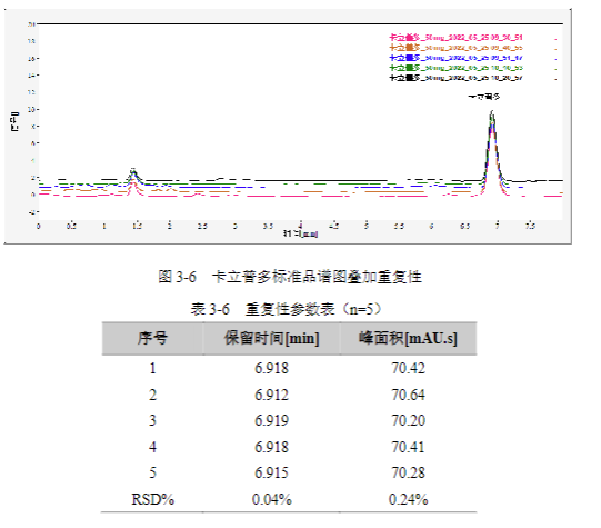 濃度為50 mg/L卡立普多 標(biāo)準(zhǔn)溶液,連續(xù)進(jìn)樣 5針,峰面積和保留時間 RSD結(jié)果如下: