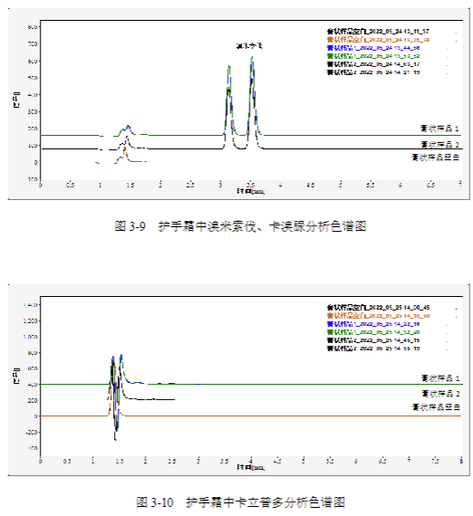 高清資料:圖 3-1 至 3-10 高清色譜圖(含峰型放大細(xì)節(jié))、護(hù)手霜樣品加標(biāo)譜圖;