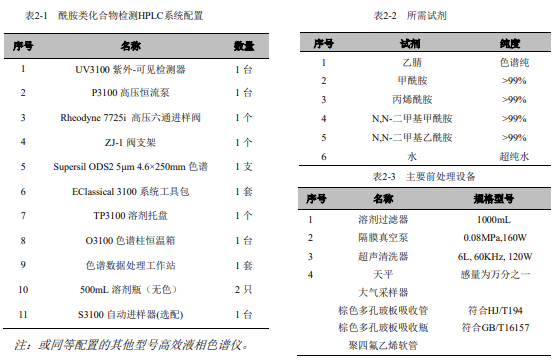 準(zhǔn)確稱取 0.100g (精確至 ±0.0001g) 甲酰胺、0.100g (精確至 ±0.0001g) N,N - 二甲基甲酰胺、0.100g (精確至 ±0.0001g) N,N - 二甲基乙酰胺和 0.100g (精確至 ±0.0001g) 丙烯酰胺,用水溶解后全量轉(zhuǎn)入 100mL 容量瓶中,用水稀釋定容至標(biāo)線,搖勻。配制成甲酰胺、N,N - 二甲基甲酰胺、N,N - 二甲基乙酰胺和丙烯酰胺濃度分別為 1000mg/L、500mg/L、1000mg/L 和 500mg/L 的酰胺類化合物混合標(biāo)準(zhǔn)貯備液,于 4℃以下冷藏、避光和密封可保存三個(gè)月,使用時(shí)應(yīng)恢復(fù)至室溫并搖勻。