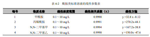 分別移取 0.10mL、2.50mL、5.00mL、8.00mL、10.00mL 酰胺類化合物標(biāo)準(zhǔn)使用液置于一組 50mL 容量瓶中,用水定容至標(biāo)線,搖勻。由低濃度到高濃度依次移取 5.0μL 注入液相色譜儀,按照液相色譜參考條件進(jìn)行分析測(cè)定。以標(biāo)準(zhǔn)系列溶液中目標(biāo)化合物的濃度 (mg/L) 為橫坐標(biāo),以峰高或峰面積為縱坐標(biāo),建立酰胺類化合物標(biāo)準(zhǔn)曲線。