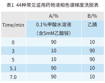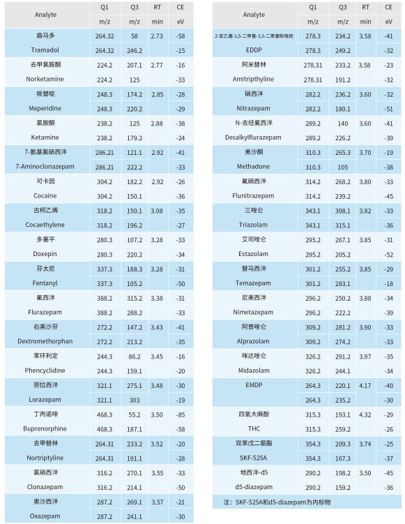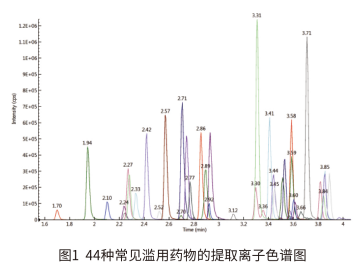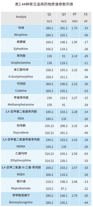 MS2 Vertical 9100 建立了快速、高靈敏度和可靠的 LC-MS/MS 實驗方法測定常見 44 種濫用藥物的含量。實驗結(jié)果表明,本方法具有分析速度快、線性范圍寬和靈敏度高等特點,適用于司法刑偵領(lǐng)域中常見濫用藥物的定性定量分析。