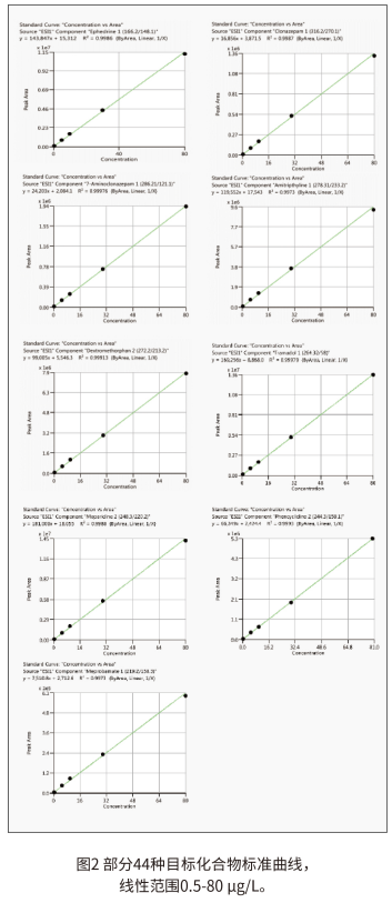 圖 1 中展示了采用目標(biāo)化合物濃度為 10.0μg/L 的提取離子色譜圖。各個化合物的峰型對稱,獲得優(yōu)異的色譜分離效果,僅需 4.5min 即可完成目標(biāo)化合物的分離,大大提高分析效率。
