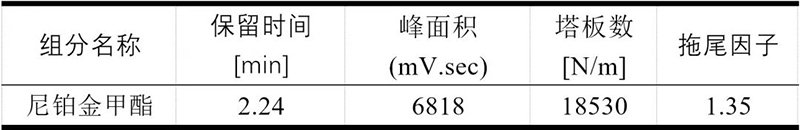 取標(biāo)準(zhǔn)品尼鉑金甲酯約0.0100g,置100mL容量瓶中,加流動(dòng)相60mL溶解,定容至刻度,制成濃度為0.1mg/mL的標(biāo)準(zhǔn)工作液,濾過(guò),取濾液即可。