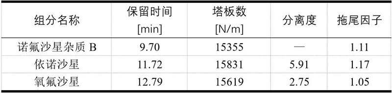 精確稱(chēng)取依諾沙星標(biāo)準(zhǔn)品5mg、諾氟沙星雜質(zhì)B2.5mg、氧氟沙星2.5mg,置于同一100mL容量瓶中,加4mL0.1mol/L的鹽酸使溶解,加流動(dòng)相稀釋至刻度線(xiàn),搖勻,即得。
